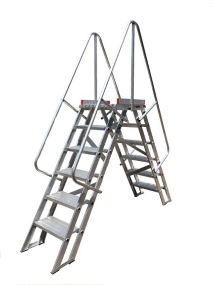 Escalera puente de doble acceso. Peldaño 230mm. Ángulo de incidencia de 60º. Plataforma de 600x 600mm. Barandillas laterales. Con montante extrafuerte y armazón indeformable. Las uniones son todas remachadas y no se aflojan con el uso. Ensamblado con unión extrafuerte patentada.